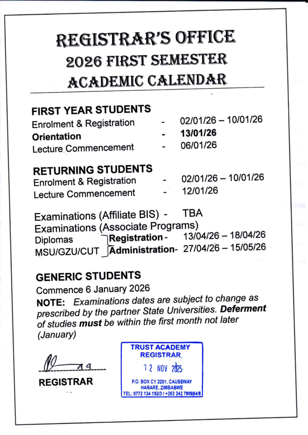 2026 Academic Calendar
